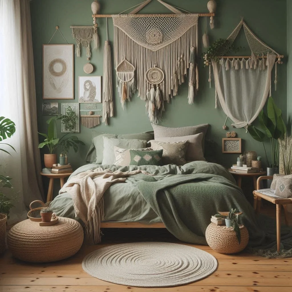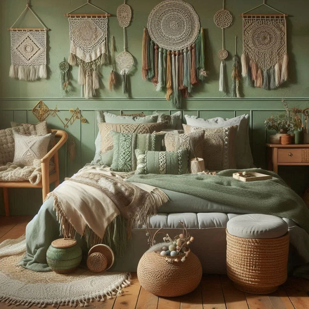 Macramé and woven decor are essential for capturing the boho style in your sage green bedroom. Incorporate a macramé wall hanging or a woven tapestry in shades of sage green to create a stunning focal point. Woven baskets, whether used for storage or as decorative accents, can add both texture and interest to the room. These handcrafted pieces infuse a sense of artistry and craftsmanship, enhancing the bohemian vibe. By blending macramé and woven elements with your sage green decor, you create a space that feels uniquely boho, inviting, and full of character.