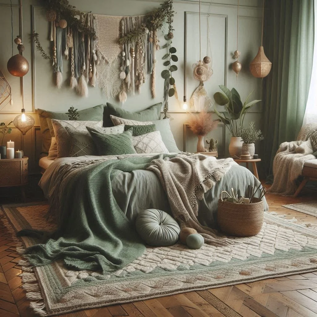 Add warmth and comfort to your bedroom with cozy rugs and carpets. Opt for shaggy rugs, patterned carpets, or a traditional kilim rug to introduce texture and visual interest to the floor. Choose rugs in neutral tones or with subtle hints of sage green to seamlessly blend with your room’s color scheme. These soft, inviting pieces not only enhance the aesthetic appeal but also provide a plush underfoot experience. By selecting the right rug, you create a cozy and welcoming atmosphere that complements your boho decor while adding an extra layer of comfort and style.