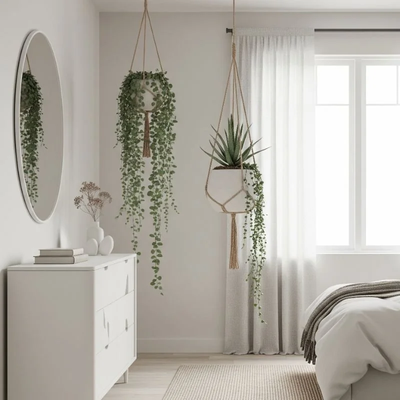 Maximize your growing space while creating dynamic visual interest through strategically placed hanging gardens that add vertical dimension to your botanical bedroom. Macrame plant hangers bring bohemian charm while showcasing trailing varieties like string of hearts, devil's ivy, or air plants that cascade beautifully. Install ceiling hooks at varying heights to create layered canopies that don't obstruct movement or natural light flow. Choose containers that complement your overall aesthetic, from ceramic pots in earth tones to modern geometric planters in metallic finishes. The key lies in balancing plant placement to avoid overwhelming the space while ensuring each specimen receives appropriate light conditions. Consider incorporating pulley systems for easier maintenance of high-hanging plants. These aerial gardens create the feeling of sleeping beneath a natural canopy while adding living sculpture elements that change and grow over time.