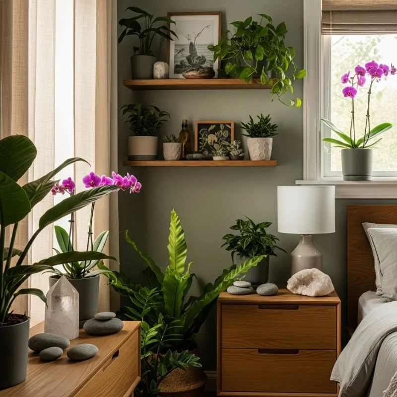 Incorporate natural stone elements and crystal formations that bring earth's ancient energy into your botanical bedroom while adding textural contrast to soft plant elements. River rocks, geodes, amethyst clusters, or simple granite pieces provide grounding weight that balances the lightness of living plants. Display crystals on windowsills where they catch light, use stone bookends for plant care guides, or create meditation corners with meaningful mineral specimens. Each stone tells a geological story spanning millions of years, adding depth and permanence to your nature-inspired space. Choose stones and crystals that resonate with your personal beliefs or simply appeal to your aesthetic preferences. Consider incorporating stone accents as plant pot saucers, decorative borders around planters, or sculptural elements that complement your botanical theme. These earth elements create perfect bridges between your living plants and architectural features while adding sophisticated natural beauty.
