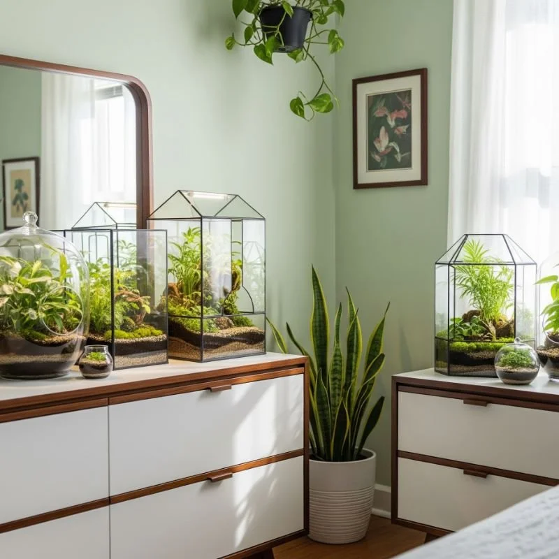 Create miniature ecosystems throughout your botanical bedroom using glass terrariums that showcase different plant varieties while adding sculptural interest and conversation-worthy focal points. These contained gardens work perfectly for areas with limited natural light or where larger plants might overwhelm the space. Design themed collections featuring succulents for desert landscapes, ferns for woodland scenes, or air plants for minimalist displays. Various glass shapes from geometric containers to vintage apothecary jars provide different aesthetic options while serving the same functional purpose. Terrarium gardens require minimal maintenance while providing maximum visual impact, perfect for busy lifestyles or frequent travelers. Consider incorporating decorative elements like colored sand, small stones, or miniature figurines that enhance your terrarium's storytelling potential. These glass gardens bridge the gap between indoor and outdoor spaces while providing opportunities for creative expression and botanical experimentation on manageable scales.