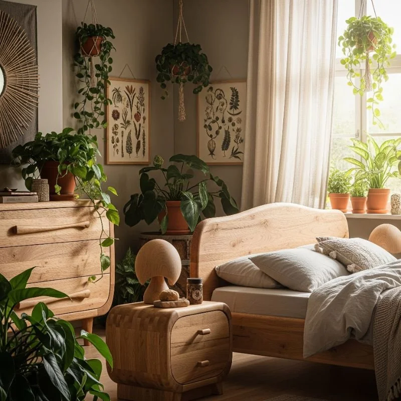 Incorporate furniture pieces crafted from natural wood with organic, flowing shapes that echo the irregular beauty found in nature's own designs. Live-edge tables, driftwood headboards, and furniture with visible wood grain bring authentic natural character that manufactured pieces cannot replicate. Choose pieces that celebrate rather than hide natural imperfections like knots, grain patterns, and unique shapes that tell stories of the tree's growth. Reclaimed wood furniture adds sustainability while providing rich patinas and character that new pieces lack. Consider incorporating tree stumps as bedside tables, branch-inspired bed frames, or wooden sculptures that serve as functional art. The goal involves creating harmony between your furniture and living plants, ensuring wood tones complement your chosen plant varieties. These organic elements ground your botanical theme in authenticity while providing sturdy, long-lasting pieces that age beautifully over time.