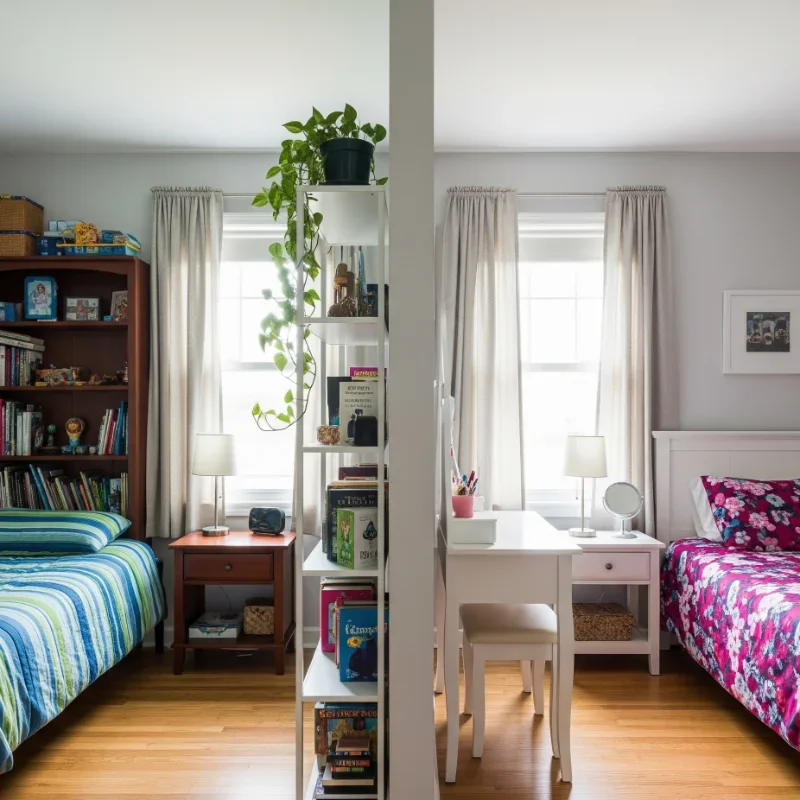 Create instant privacy without construction by using curtains or screens as flexible room dividers! Ceiling-mounted curtain tracks allow kids to open their space for play or close it for alone time. Choose curtains in fun patterns that complement your color scheme, or go with simple white for a clean look. Folding screens offer portable privacy that moves as needs change. Consider bookshelf room dividers that provide storage while separating spaces. The beauty of soft dividers? They make small rooms feel less cramped than permanent walls. Kids love the control of opening and closing their "door" as needed. For a whimsical touch, use canopy curtains around each bed area. This solution costs less than building walls and adapts easily as children grow. Your room gains flexibility while each child gets that crucial sense of personal space.