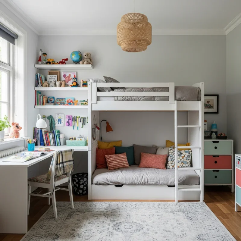Maximize floor space with bunk beds that turn vertical space into sleep and play areas! Modern bunks go beyond basic stacked beds: L-shaped configurations create natural zones, while bunks with built-in desks maximize functionality. Let kids negotiate who gets top or bottom, or rotate monthly for fairness. Safety rails and sturdy ladders are non-negotiable. Consider bunks with curtains or tents for each level, giving both children their own fort. Twin-over-full bunks accommodate different ages or visiting friends. Some designs include built-in storage drawers or shelving. Position bunks to leave maximum open floor space for shared play. Add reading lights for each bunk so one child can sleep while the other reads. This classic solution has evolved into stylish options that look great while solving the space crunch. Your vertical thinking creates more room for activities and storage!
