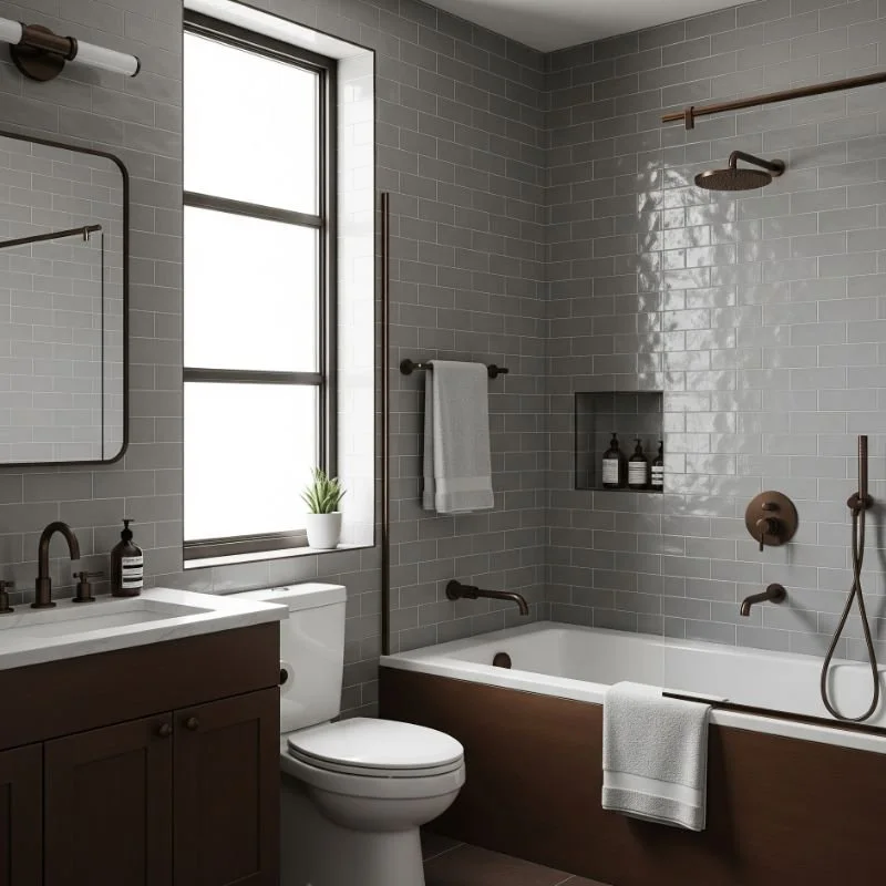 Transform classic subway tiles from basic to sophisticated by choosing grey tiles and pairing them with warm bronze fixtures. This unexpected combination adds depth and luxury to traditional bathroom design. The grey subway tiles create a timeless backdrop while bronze faucets, showerheads, and hardware add warmth and vintage charm. It's like adding antique jewelry to a modern outfit! The metallic brown tones in bronze bridge the gap between grey and brown beautifully. Oil-rubbed or brushed bronze finishes work particularly well. This combination prevents the bathroom from feeling too cool or sterile. Consider adding bronze-framed mirrors to complete the look. Your bathroom achieves both classic style and modern sophistication.