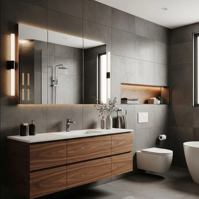 Q2: Can I mix different wood tones in brown and grey bathrooms?