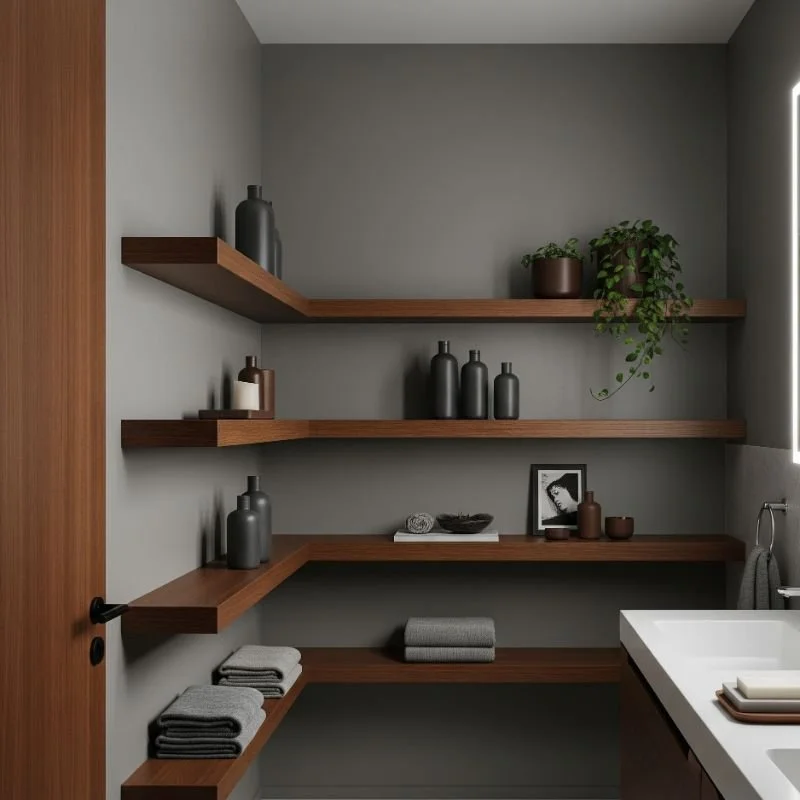 Maximize storage and style with warm brown floating shelves against cool grey walls. This practical solution adds function while creating visual interest through color contrast. The shelves provide space for towels, toiletries, and decorative items while the brown wood warms up grey walls. It's like adding functional art to your bathroom! Choose thick wooden shelves for substantial visual impact. The floating design keeps floors clear and bathrooms feeling spacious. Mix shelf lengths for dynamic arrangement. Natural wood grain adds organic texture to smooth painted walls. Your bathroom gains both storage and style through this simple addition.
