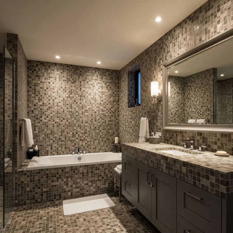 Create a stunning focal point with natural stone mosaic tiles incorporating both brown and grey tones. Use these mixed mosaics for shower floors, accent walls, or backsplashes. The natural variations in stone create organic patterns that feel both earthy and elegant. It's like bringing a river rock collection into your bathroom design! The combination of colors ties together other brown and grey elements throughout the space. Natural stone adds luxury and durability to high-moisture areas. Each tile arrangement is unique, creating one-of-a-kind installations. Seal natural stone properly to maintain its beauty. Your bathroom gains artistic sophistication through nature's own color palette.