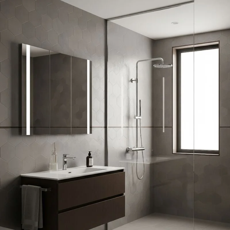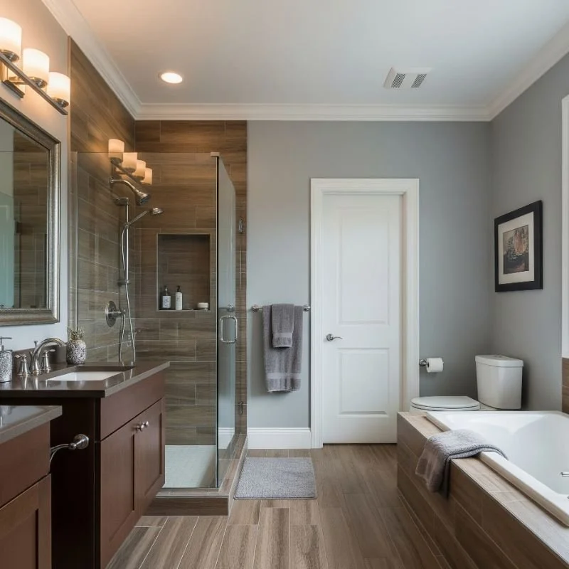 Get the warmth of wood without the maintenance worries by choosing brown wood-look tiles for your bathroom floor. Pair them with soft grey walls for a sophisticated look that balances rustic charm with modern practicality. The tiles provide visual warmth and texture while remaining completely waterproof. It's like having a cozy cabin floor that never warps or stains! Grey walls keep the wood tones from overwhelming the space. This combination works beautifully in any size bathroom. The linear patterns of wood-look tiles can make small bathrooms appear larger. Choose matte finishes for authentic wood appearance. Your bathroom gains both style and function through this smart pairing.