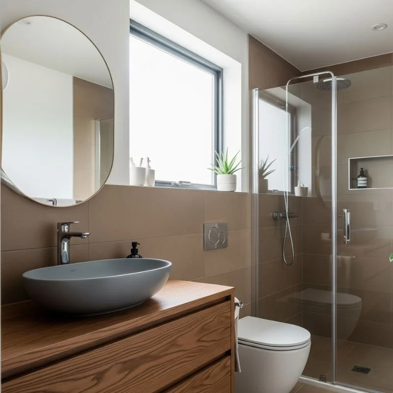 Create visual drama through color blocking with mocha brown and dove grey paint or tiles. This modern technique defines different areas of your bathroom while maintaining color harmony. Use brown for lower walls and grey for upper portions, or create geometric patterns. It's like creating abstract art with your bathroom walls! The soft tones prevent the bold technique from overwhelming the space. Color blocking works particularly well in bathrooms with interesting angles or alcoves. Use painter's tape for crisp lines between colors. This approach adds architectural interest without renovation. Your bathroom gains contemporary style through this creative color application.