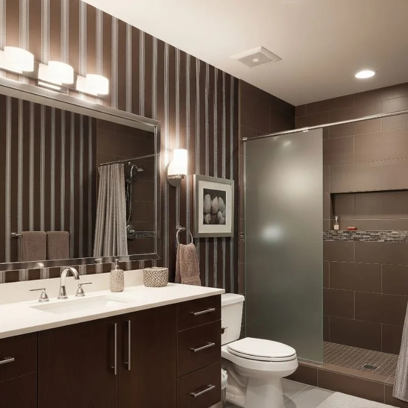 Make a bold statement with alternating chocolate brown and silver grey stripes on an accent wall. This graphic approach adds visual interest and movement to your bathroom design. The stripes can run horizontally to widen the space or vertically to add height. It's like dressing your walls in a designer pattern! Use tile, paint, or wallpaper to achieve this striking look. The contrast between dark brown and metallic grey creates sophisticated drama. Keep other elements simple to let the stripes shine. This technique works especially well behind vanities or in shower areas. Your bathroom gains personality and style through this eye-catching design choice.