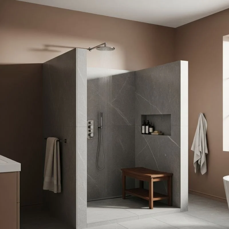 Design a spa-worthy shower using grey stone tiles with a built-in or freestanding brown wooden bench. This combination brings natural elements together for ultimate relaxation. The grey stone provides a cool, calming backdrop while the warm wood bench adds comfort and visual warmth. It's like bringing a luxury spa experience home! Choose teak or other water-resistant woods for durability. The organic grain patterns in wood contrast beautifully with uniform grey stone. This pairing works especially well in walk-in showers. Consider adding a brown wooden mat for additional warmth underfoot. Your shower becomes a daily retreat that balances modern luxury with natural comfort.
