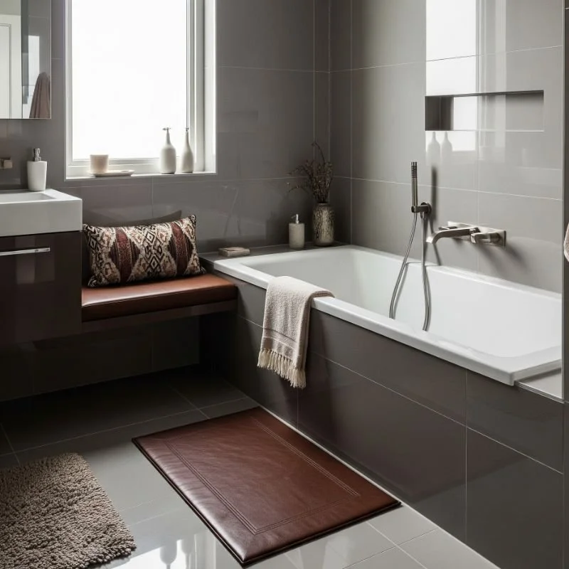 Add unexpected luxury with brown leather accents in your predominantly grey bathroom. Think leather-wrapped mirror frames, storage baskets, or even a small leather stool. These touches bring warmth and texture that softens grey's sometimes austere feeling. It's like adding a vintage leather jacket to a modern outfit! The natural patina of leather improves with age and humidity. Choose cognac or chocolate leather tones to complement various grey shades. These accents work particularly well in masculine or industrial-style bathrooms. The combination of hard grey surfaces with soft leather creates appealing contrast. Your bathroom gains personality through these unique decorative elements.