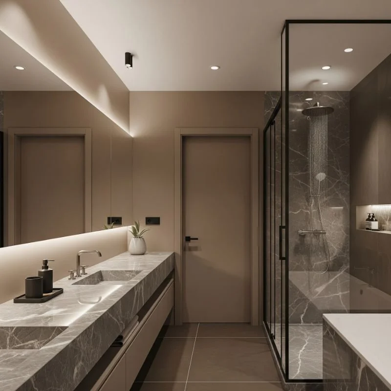 Create subtle elegance with warm taupe walls complemented by cool grey marble countertops. This sophisticated pairing offers the best of both worlds: warmth from the walls and luxury from the marble. The taupe provides a neutral backdrop that makes grey veining in the marble stand out like artwork. It's like wrapping your bathroom in cashmere while adding precious stone accents! The soft brown undertones in taupe prevent the space from feeling cold. Natural light plays beautifully off both surfaces throughout the day. Consider Carrara or Calacatta marble for classic appeal. The combination suits both traditional and contemporary styles perfectly. Your bathroom achieves understated luxury through this refined color marriage.