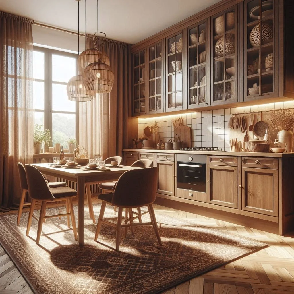 Incorporating natural materials like wood, stone, and metal can significantly enhance the warmth of your brown kitchen. Wooden beams, stone countertops, and copper fixtures infuse rustic charm and elegance into the space. These elements create a harmonious, earthy feel that perfectly complements the rich brown tones. The natural textures and colors of wood, stone, and metal add depth and character, making the kitchen feel cozy and inviting. Wooden beams provide a classic, rustic look, stone countertops offer durability and a touch of nature, while copper fixtures introduce a warm, metallic sheen. Together, these materials create a balanced and aesthetically pleasing environment that enhances the overall ambiance of your kitchen.