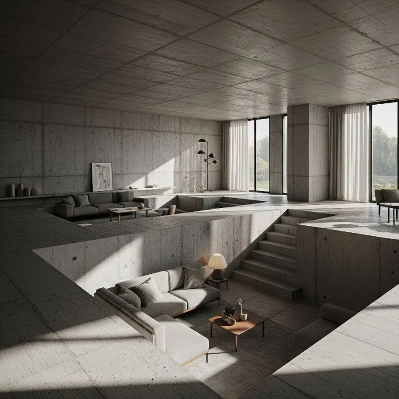 Create architectural drama with sunken living areas accessed by concrete steps. This design move adds dimension and defines spaces without walls, perfect for open-plan urban living. The level change creates intimate conversation areas while maintaining visual flow. It's like creating a concrete amphitheater in your own home! The steps themselves become sculptural elements and can double as additional seating. Use built-in concrete seating around the sunken area for cohesive design. This feature works best with higher ceilings to prevent feeling cramped. Add soft furnishings and rugs to the sunken area for comfort while maintaining the architectural statement above.