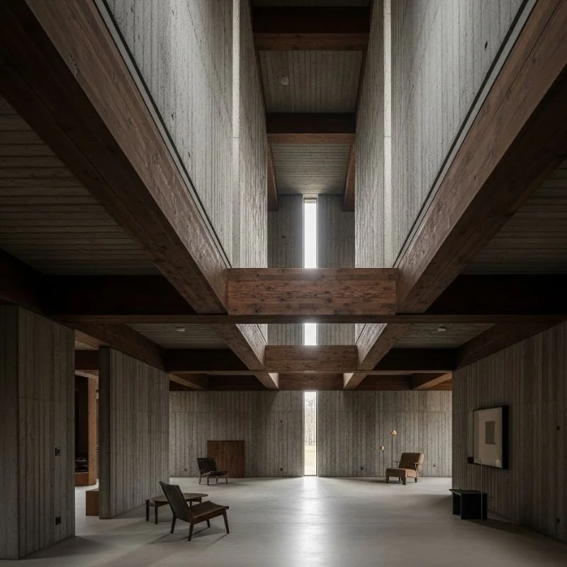 Introduce warmth to brutalist spaces by incorporating heavy wooden beams against concrete surfaces. This material contrast softens concrete's coldness while maintaining the style's substantial feel. The organic grain patterns in wood provide visual relief from geometric rigidity. It's like adding a natural heartbeat to an urban fortress! Use reclaimed or raw timber for authentic character and environmental consciousness. The beams can be structural or purely decorative, running across ceilings or walls. Dark-stained wood creates drama while lighter tones add Scandinavian influence. This combination bridges brutalism with other design styles, making spaces more livable while maintaining architectural integrity.