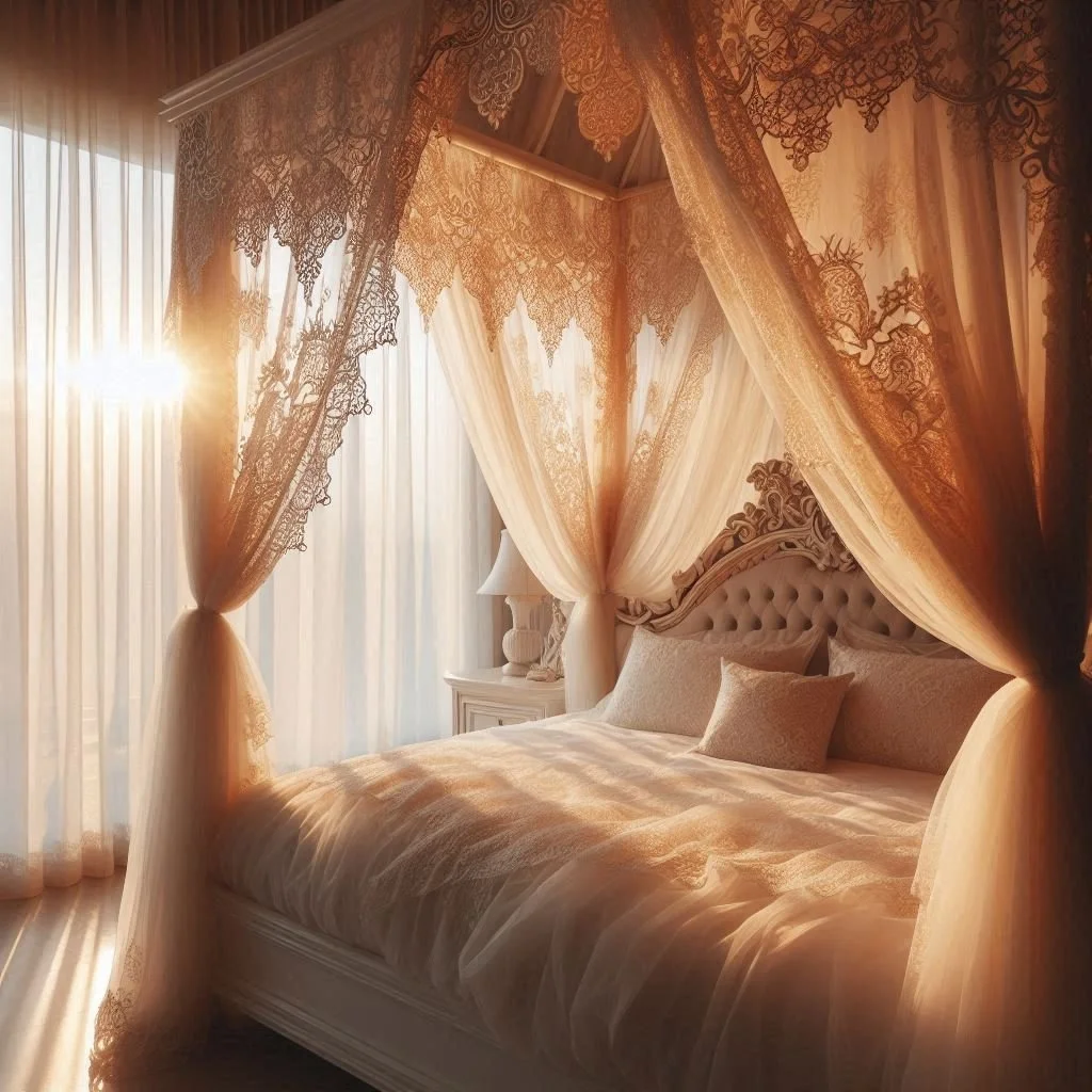 Sheer curtains, velvet, silk, and linen are all great options for canopy bed drapes, depending on the look and feel you want to achieve.