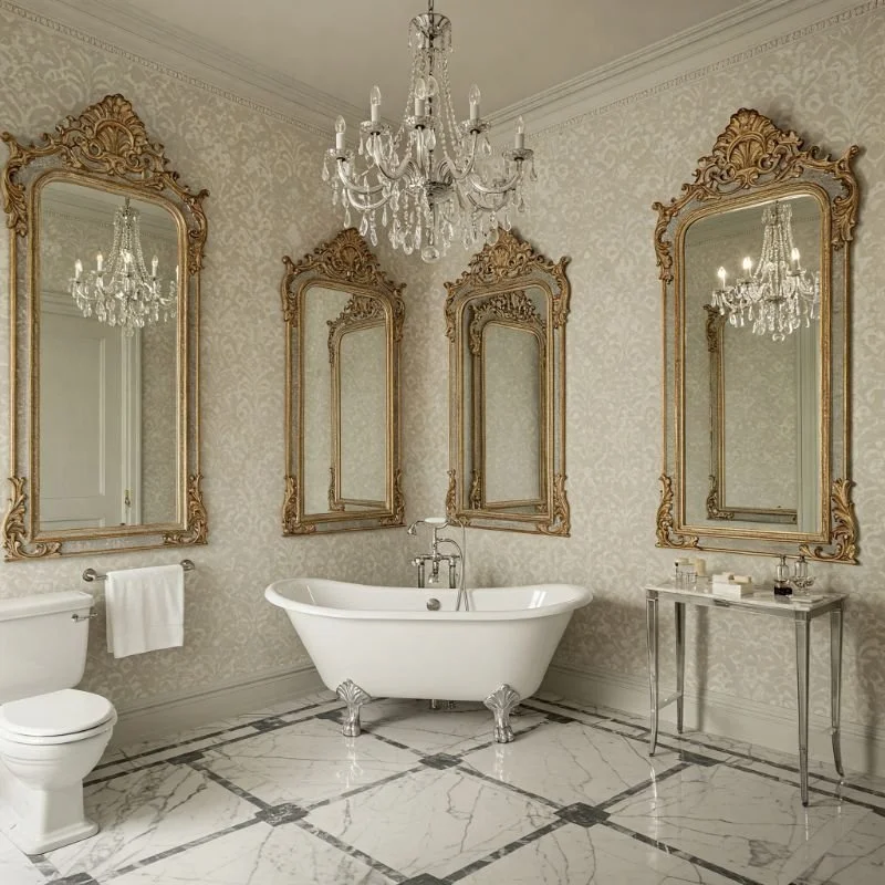 An ornate mirror acts as the crowning jewel in a classic bathroom, reflecting both light and style. Think of extravagant, baroque-inspired frames carved with intricate motifs, or art deco shapes that capture the essence of the early 1900s. These mirrors do more than just help you check your reflection—they anchor the space and can even influence how large or bright the room feels. By positioning an ornate mirror above a pedestal sink or a vintage vanity, you create a cohesive look that feels meticulously curated. The reflective surface also doubles as a design element that bounces light around, drawing attention to the details of your tile work, fixtures, and accessories. Choose materials like gold leaf, aged silver, or antique wood finishes to further amplify the sense of history and luxury. In short, an ornate mirror doesn’t just fill a practical need; it encapsulates the grandeur of a bygone era right in your bathroom.