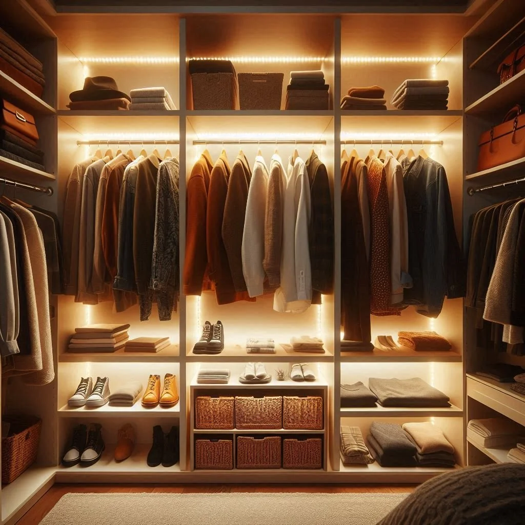 Battery-powered puck lights and LED strip lights are great for small closets as they take up minimal space while providing ample light.