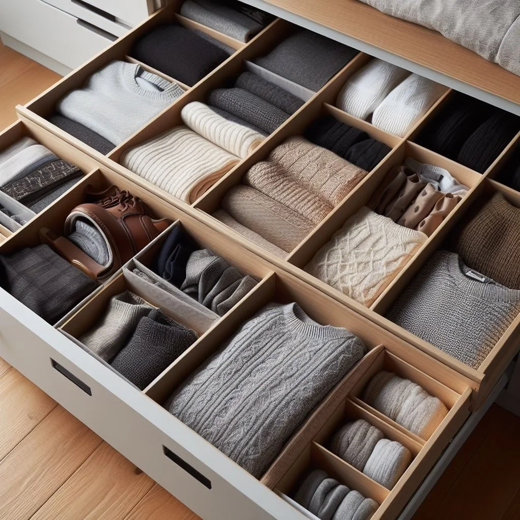Say goodbye to chaotic drawers and embrace the order with the assistance of dividers. These handy tools ensure that socks, underwear, and accessories remain neatly separated, offering a streamlined and stress-free start to your morning routine. By implementing dividers, each item finds its designated space, eliminating the frustration of rummaging through tangled undergarments or mismatched accessories. This simple organizational solution not only optimizes drawer space but also enhances your daily efficiency, allowing you to locate what you need at a glance. Bid farewell to drawer chaos and welcome a more organized, serene, and time-efficient beginning to your day.