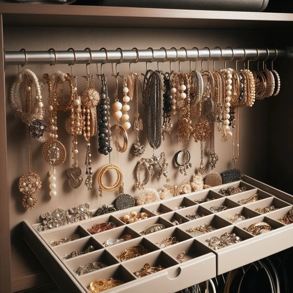 Use jewelry trays and hooks to keep your jewelry tangle-free and easily accessible.