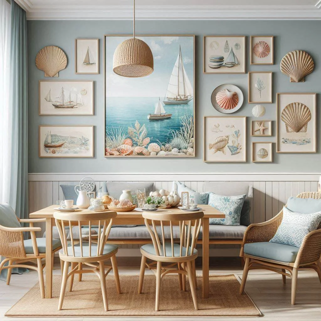 Art plays a crucial role in defining the ambiance of your dining room, especially in a coastal theme. Opt for ocean-inspired artwork, such as seascape paintings or beach photography, to evoke the soothing essence of seaside living. Select pieces that resonate with your personal taste and complement the overall coastal aesthetic. A thoughtfully chosen artwork can become a striking focal point, adding both visual interest and a sense of tranquility to the space. By incorporating art that reflects the serene beauty of the sea, you enhance the room's ambiance and create a calming environment perfect for dining and relaxation.