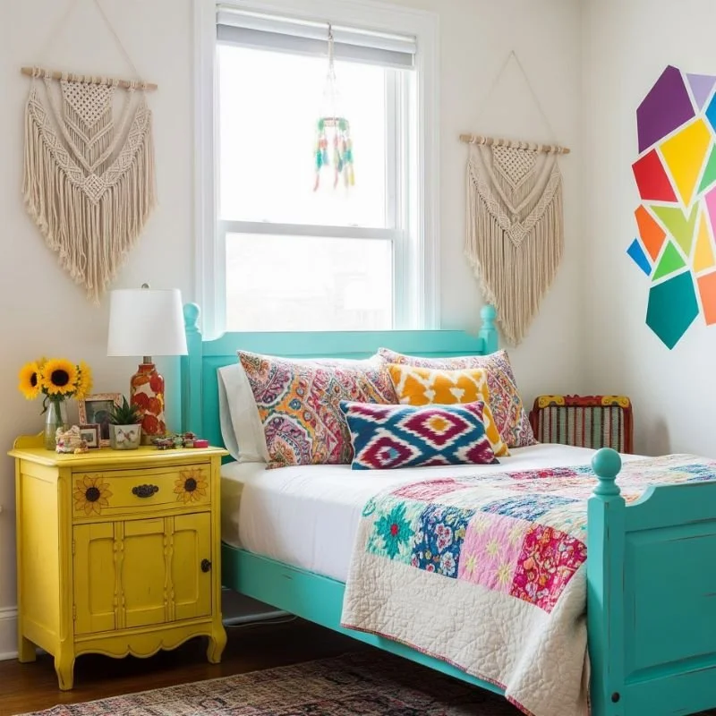 Breathe new life into tired furniture by painting pieces in unexpected, vibrant colors that complement your boho palette. Transform a basic dresser with turquoise paint and gold leaf details, or give nightstands ombré treatments from coral to pink. Paint bed frames in deep jewel tones or create rainbow effects on bookshelf backs. Use chalk paint for matte finishes that enhance the handmade aesthetic. Add painted mandalas or geometric patterns for extra personality. Don't forget details: paint drawer interiors in surprise colors or add colorful knobs and pulls. This DIY approach lets you customize furniture to perfectly match your vision while creating one-of-a-kind pieces that anchor your colorful sanctuary.