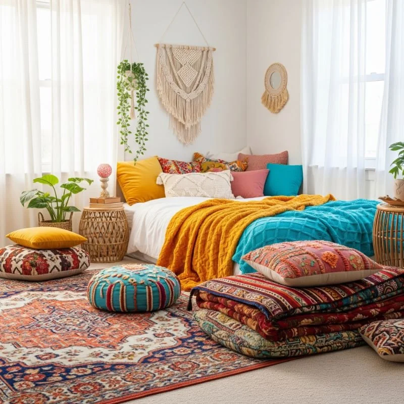 Master the boho art of pattern mixing through a carefully curated pillow collection that seems effortlessly eclectic. Combine geometric kilim designs with floral block prints, tribal mudcloth patterns with tie-dye swirls, and embroidered suzani motifs with bold stripes. The secret lies in maintaining a consistent color palette while varying pattern scales. Use odd numbers for visual balance: seven pillows often work better than six. Mix shapes too: standard squares with lumbar pillows and round cushions. Add texture through tassels, pom-poms, and fringe in coordinating colors. Arrange them asymmetrically for that perfectly imperfect boho look. This pillow party becomes an ever-changing art installation you can rearrange whenever inspiration strikes.