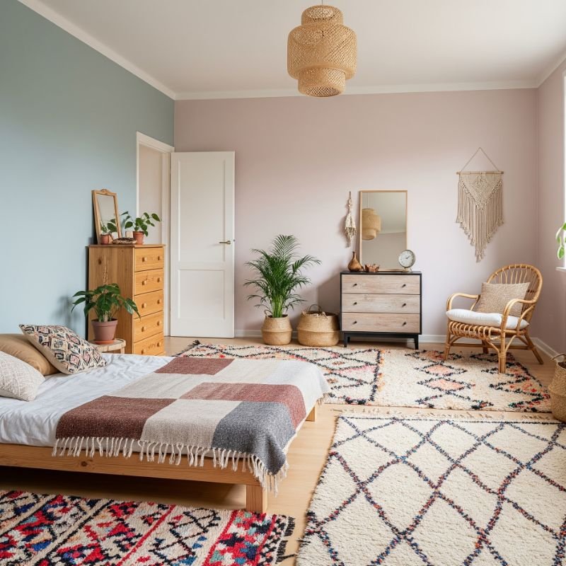 Anchor your boho bedroom with authentic Moroccan rugs that explode with geometric patterns and bold color combinations. These handwoven treasures feature diamonds, zigzags, and tribal motifs in combinations like fuchsia with turquoise or saffron with crimson. Layer multiple rugs for extra bohemian flair; overlap different sizes and patterns confidently. Vintage Beni Ourain styles offer cream backgrounds with colorful accents, while Boucherouite rugs showcase recycled fabric strips in rainbow hues. Position larger rugs to extend beyond your bed, creating defined zones. Smaller kilims work perfectly as wall hangings or draped over furniture. These rugs aren't just floor coverings; they're artistic foundations that set your room's entire color story.