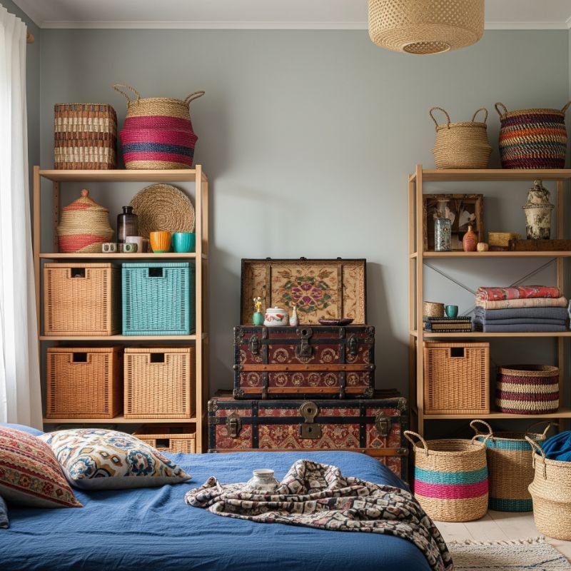 14. Colorful Storage Solutions: Baskets, Trunks, and Shelving