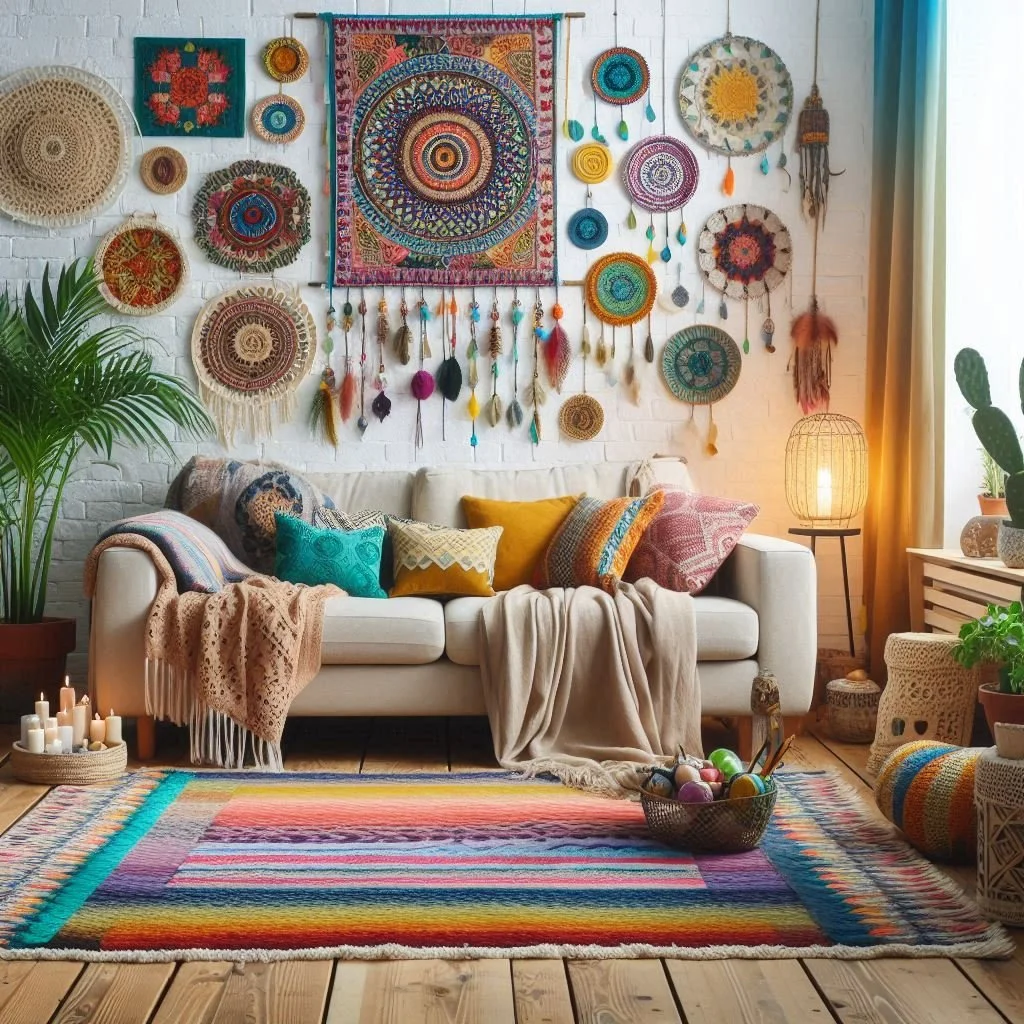 A colorful Boho living room that showcases art and crafts creates a vibrant and inviting space. Begin with rich, saturated colors like deep blues, purples, and oranges that are often associated with Boho style, applied through wall paints, textiles, and decorative accents. Include handcrafted items such as macramé wall hangings, woven rugs, and hand-painted ceramics to infuse personality and uniqueness into the decor. Arrange eclectic art pieces, from tribal prints to contemporary abstracts, on the walls to serve as striking focal points. The furniture should be comfortable and eclectic, combining vintage finds with modern pieces and plenty of plush, patterned cushions to enhance the cozy, artistic vibe of the room.