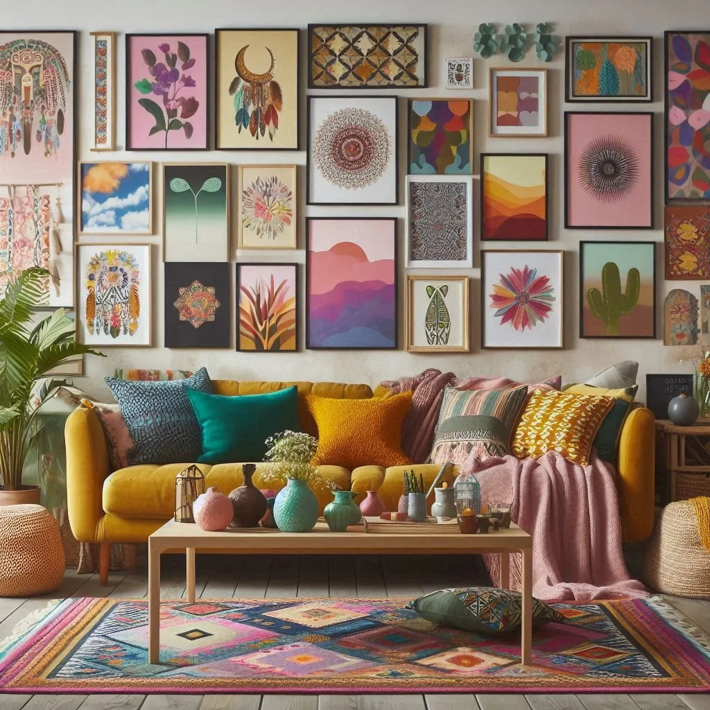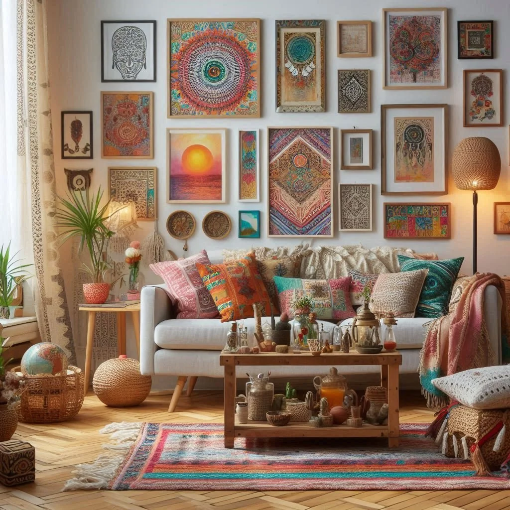 A gallery wall is a fantastic way to showcase your unique personality and style in a Boho living room. Combine a variety of art pieces, from eclectic prints and abstract paintings to personal photographs, for a visually stimulating display. Incorporate mirrors and decorative objects to add depth and interest, creating a dynamic and layered look. This ever-evolving feature allows you to continually refresh and update the arrangement, reflecting your changing tastes and interests. Whether you’re adding new art or rearranging existing pieces, a gallery wall offers endless opportunities for creative expression and personal flair.