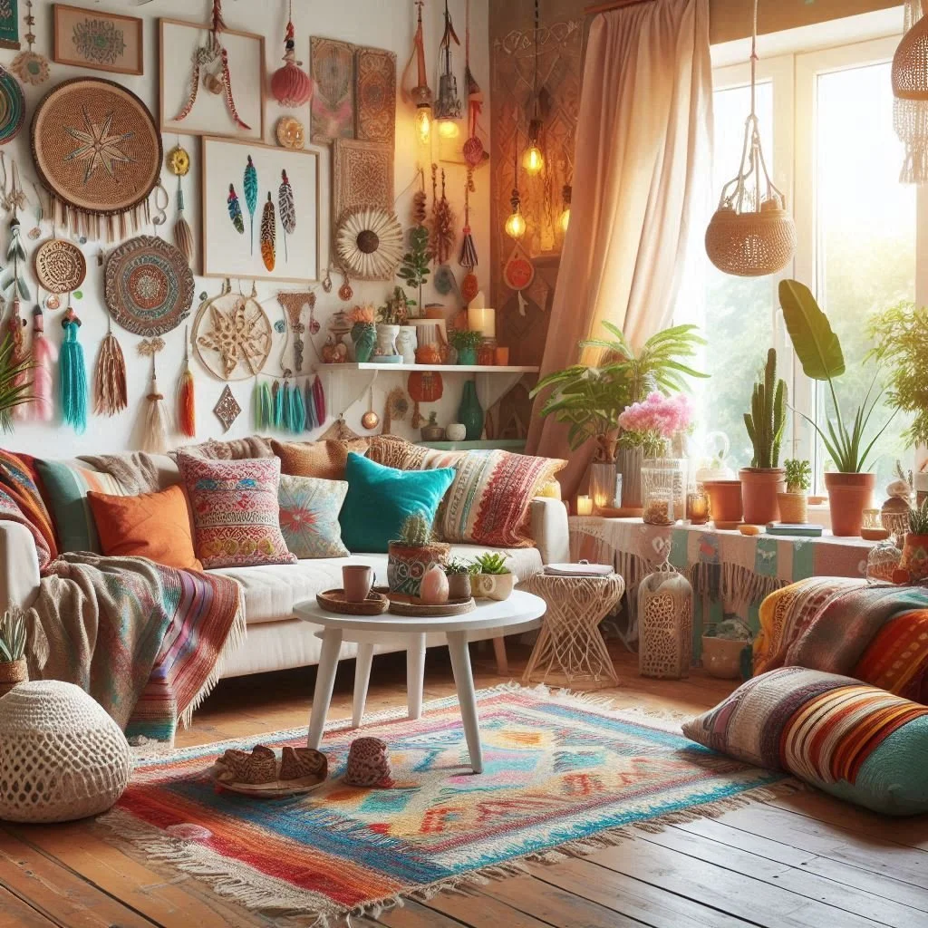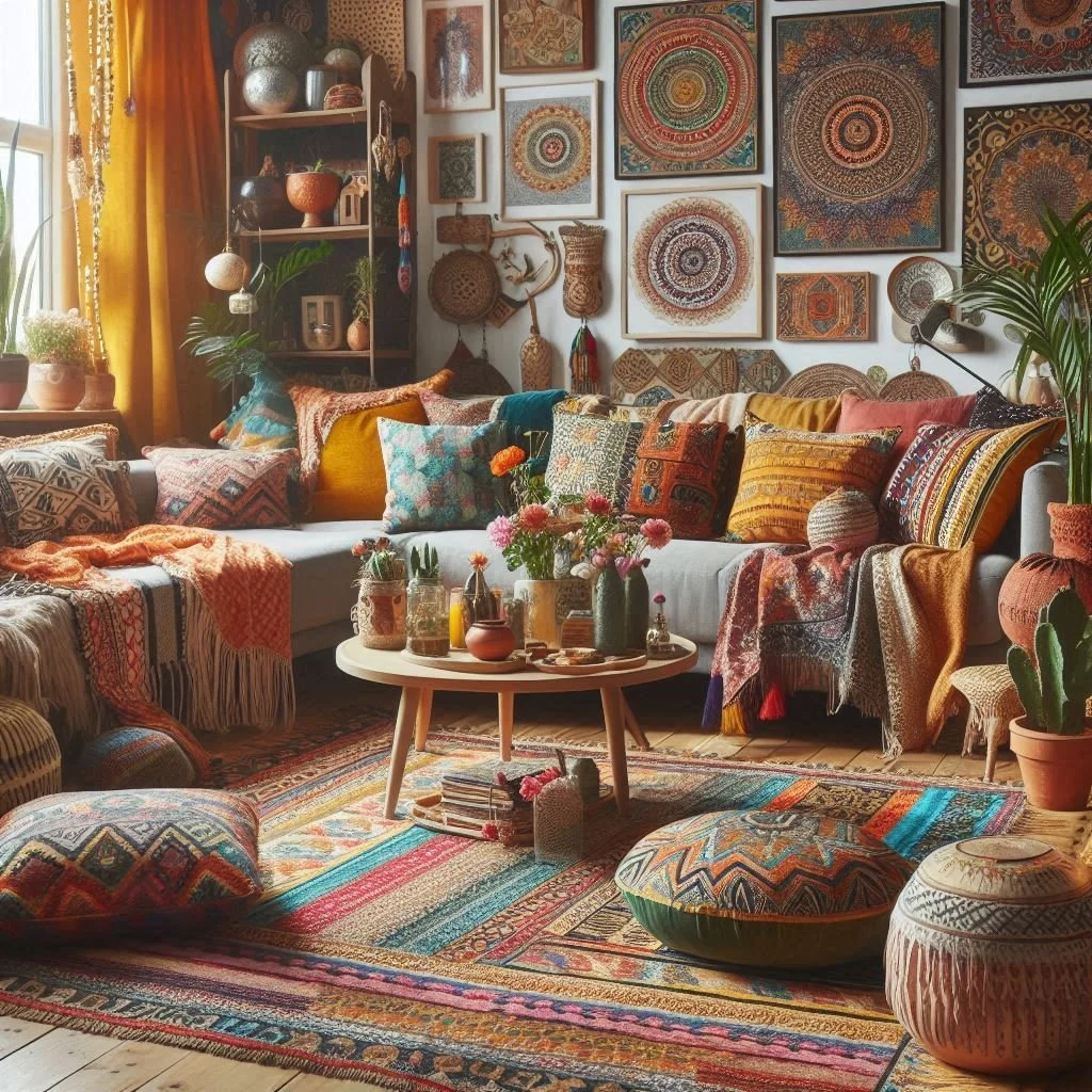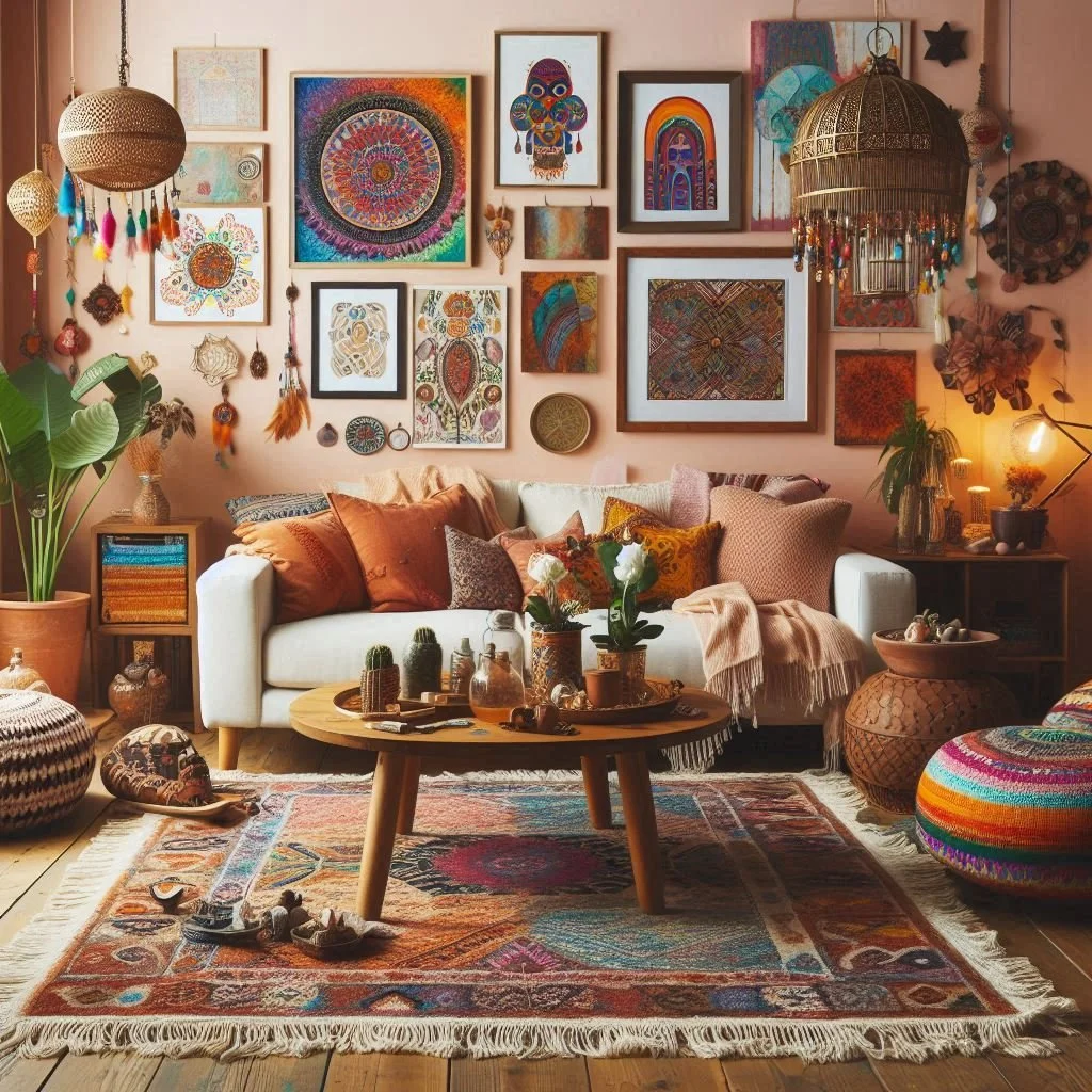Natural materials like wood, rattan, jute, and cotton work well in a Boho living room. These materials add texture and a grounded feel to the space.