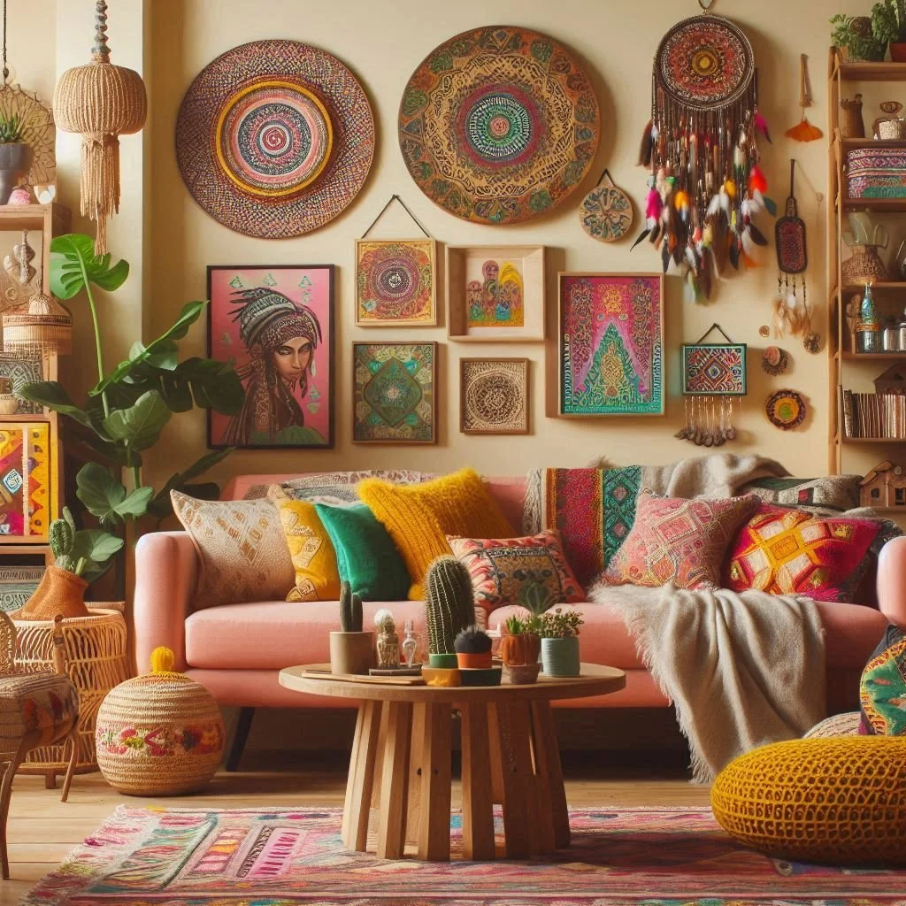The Boho style is synonymous with bold and vibrant colors. Embrace jewel tones like emerald green, sapphire blue, and ruby red to create a rich, luxurious feel. Earthy neutrals such as terracotta, ochre, and deep browns can ground the space, providing a warm and inviting backdrop. For added vibrancy, incorporate bright accents like hot pink or bright yellow to infuse energy and excitement into the room. Mixing these colors not only creates a dynamic visual appeal but also captures the eclectic essence of Boho design, making your space both lively and cozy.