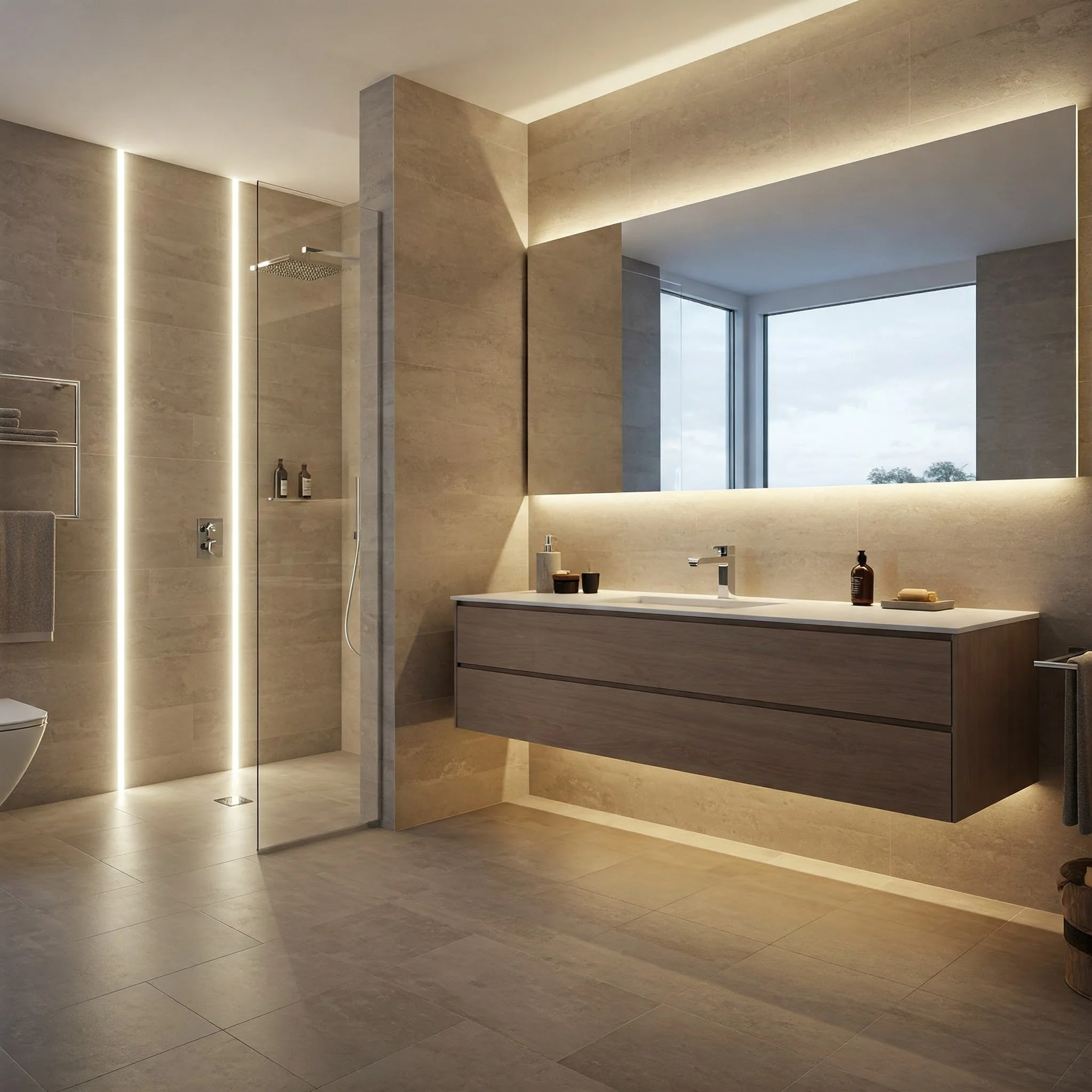 Lighting is the unsung hero of any bathroom design, especially in a contemporary setup. Opt for innovative lighting solutions that do more than just brighten the space. LED strips under floating vanities or around mirrors create a soft glow, perfect for those middle-of-the-night visits when you don’t want to be blinded by overhead lights.