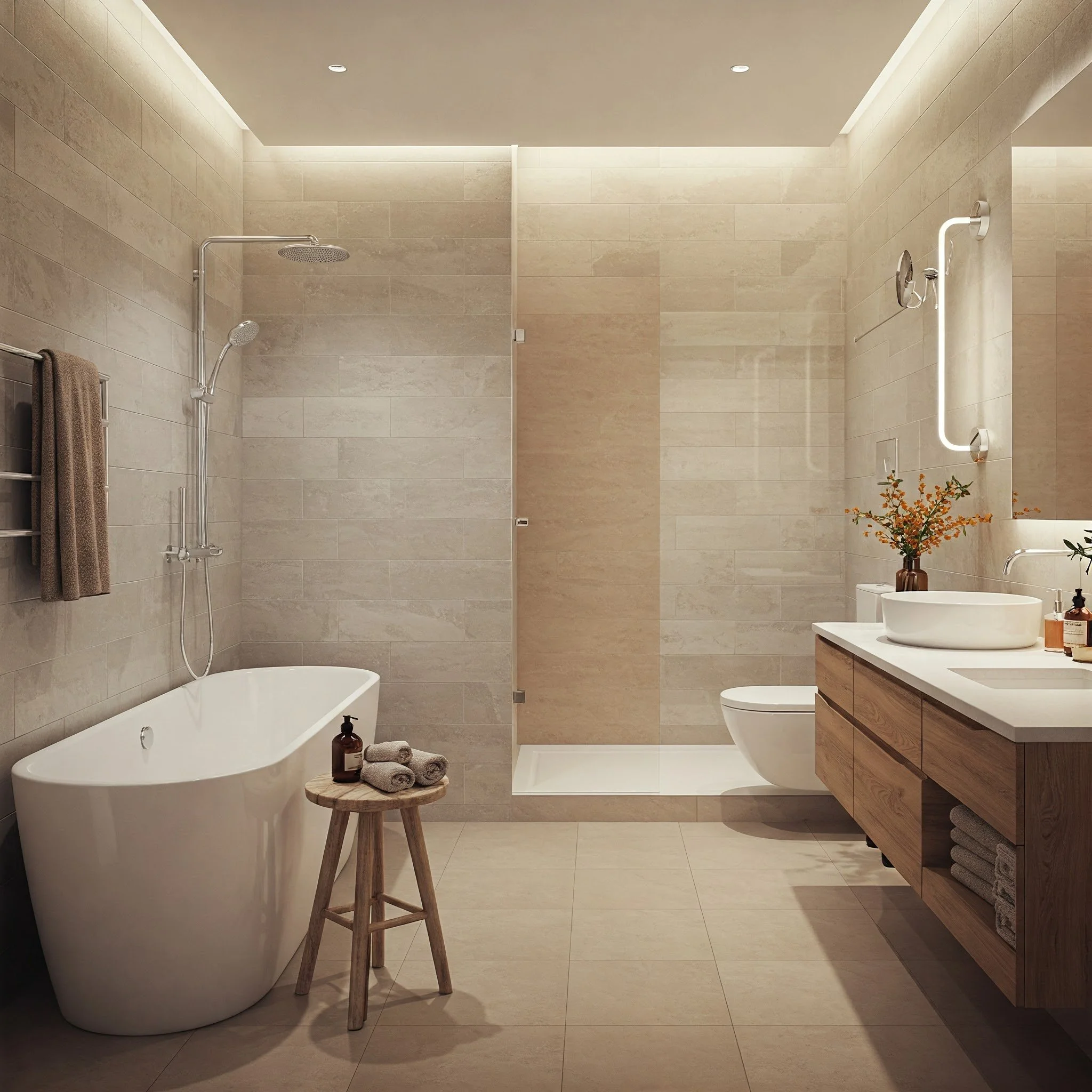 When many of us think “contemporary,” we picture soothing grays, bright whites, and soft beiges. These neutrals are popular for good reason: they’re endlessly versatile, easy on the eyes, and help smaller bathrooms feel larger. However, going all-neutral can sometimes risk feeling a little too clinical or bland. The key is balance.