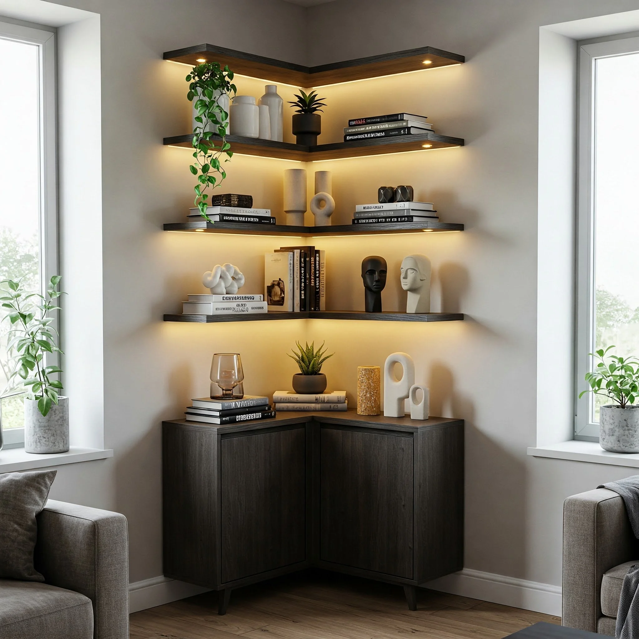 Floating shelves add a dash of modern minimalism, and when placed in a corner, they become an unexpected style statement. Visualize sleek wooden or metal shelves that seem to hover, free of bulky brackets or supports. It’s like a gentle art installation that doubles as storage for books, plants, or decorative knick-knacks. Floating corner shelves can also bring dimension to a plain wall, breaking up the linear monotony with tiered levels. They’re an excellent choice for small spaces, too, since their open design doesn’t overwhelm the room. Experiment with staggered heights, varying shelf lengths, or even two-tone finishes to customize the vibe. Whether you opt for a single corner shelf as a spotlight for a prized object or a series of tiers for practical storage, this concept merges form and function seamlessly.
