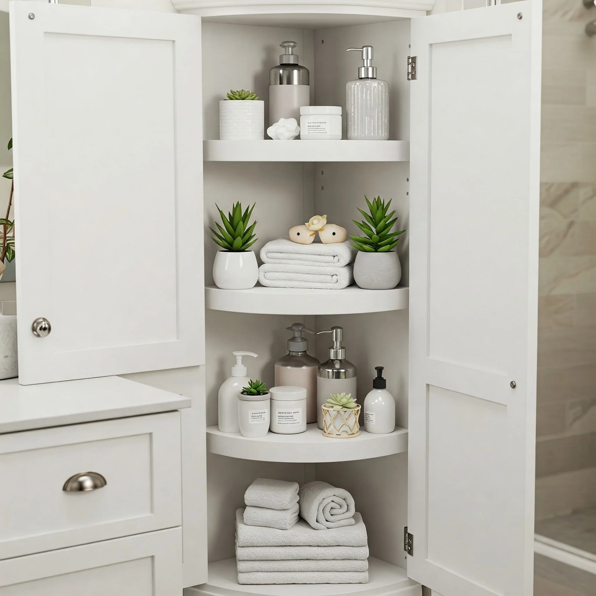 The bathroom might be one of the most challenging places to find extra storage, especially if you’re juggling towels, toiletries, and cleaning supplies. Tiered corner bathroom cabinets turn that puzzle into a tidy picture, stacking multiple shelves in a vertical layout that snugly fits a vacant corner. Think of it as a mini tower of storage, where each level holds specific essentials: rolled-up towels on the bottom, everyday products in the middle, and decorative items like small plants or scented candles on top. Some designs include doors or drawers for personal items you’d rather keep out of sight. By stretching your storage upward, you’ll free up countertop space, making your bathroom feel less cluttered and more spa-like. It’s a small tweak with an impressively big impact on daily organization.