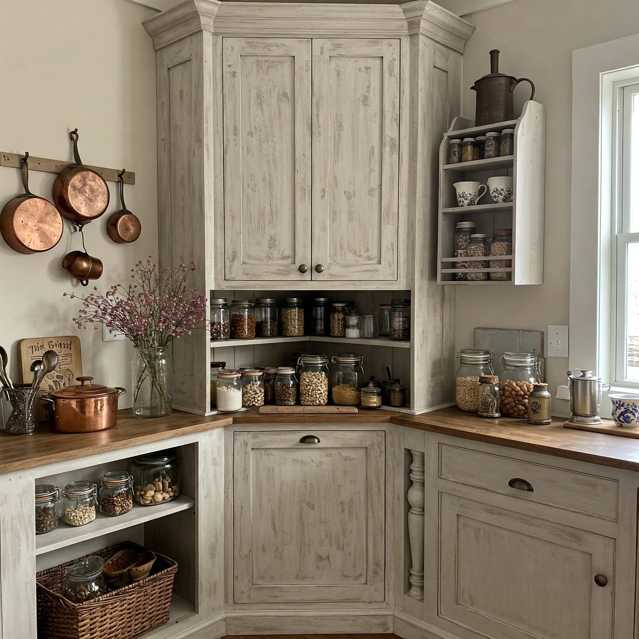 Imagine having a dedicated mini-pantry tucked cozily into a corner, ready to store all your dry goods, spices, and snacks. A corner pantry cupboard does exactly that, transforming a seemingly useless angle into your household’s secret stash zone. You can opt for floor-to-ceiling shelves or incorporate vertical pull-outs that neatly line up cans and jars. Some designs even include a small countertop inside, giving you an extra prep station. This mini “room within a room” can become an organizational dream, especially if you add labeled baskets or clear containers for easy inventory checks. The advantage is clear: instead of scattering your groceries across multiple cabinets, everything’s centralized in a single, efficient space. And let’s be honest—who doesn’t love the thrill of opening a pantry door to a well-sorted, snack-filled haven?