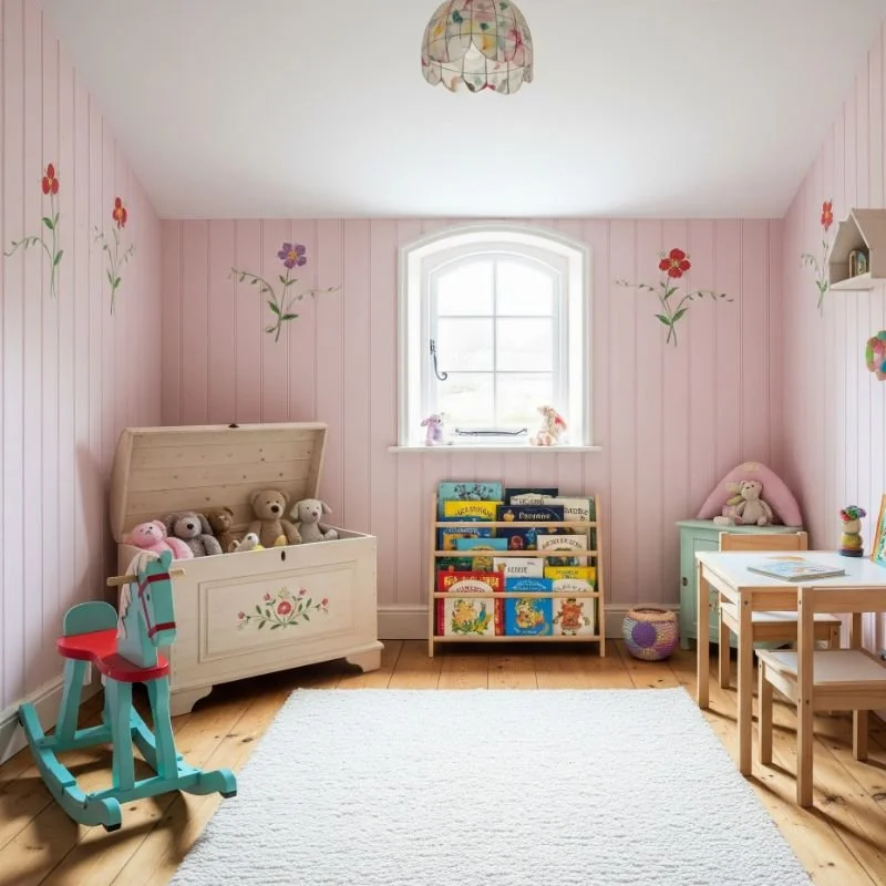 Create a magical cottage-style retreat for little ones that grows with them. Start with soft, gender-neutral colors like pale yellow, mint, or lavender. Add whimsical wallpaper featuring woodland creatures or delicate patterns. Choose vintage-inspired furniture that can transition through different ages: a painted wooden bed, antique dresser, and cozy reading chair. Display toys and books on open shelving, making cleanup part of the decor. Hang bunting or paper lanterns for playful touches. Include plenty of soft textiles: quilts, cushions, and a plush rug for playing. Add personal touches like framed artwork and handmade items. The room should spark imagination while maintaining cottage charm.
