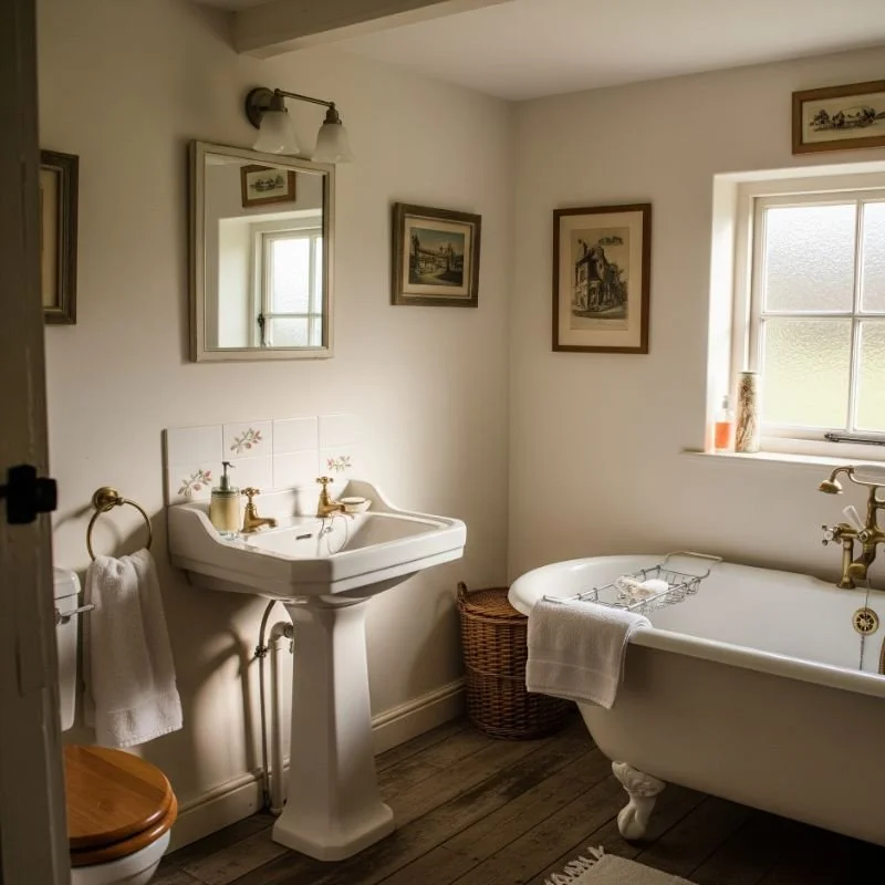 Turn your bathroom into a cottage sanctuary by embracing vintage charm and modern comfort. Install a clawfoot tub if space allows, or add a vintage-style pedestal sink for instant character. Replace modern fixtures with cross-handle faucets in brushed brass or oil-rubbed bronze. Add beadboard wainscoting painted in soft white or pale blue, topped with floral or toile wallpaper. Display fluffy white towels in woven baskets, hang a vintage mirror with ornate detailing, and add mason jar soap dispensers. Include fresh flowers or eucalyptus sprigs in a small pitcher. Even the smallest bathroom can overflow with cottage charm when you focus on details that matter.
