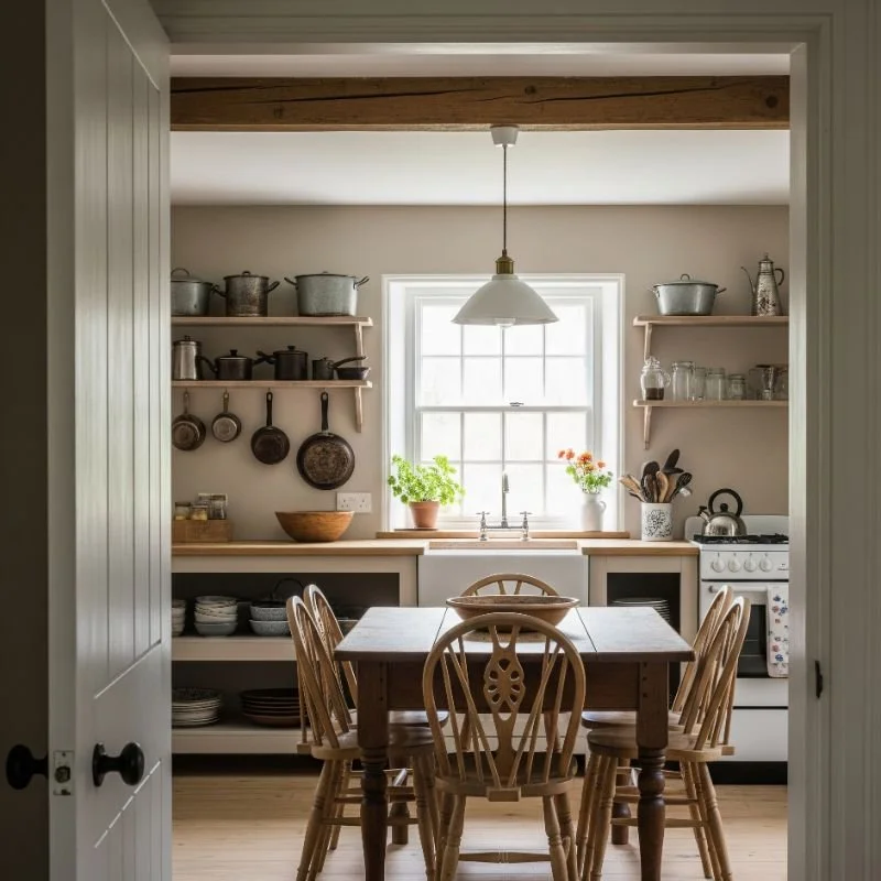 Forget matching dining sets; cottage style celebrates the beauty of mixing and matching. Pair a rustic farmhouse table with an eclectic mix of chairs: perhaps vintage wooden chairs, a bench on one side, and even upholstered end chairs. Paint chairs in complementary colors or leave them in their natural patinas. Hang a vintage chandelier or pendant lights with Edison bulbs for warm ambiance. Display your prettiest dishes on a painted hutch or open shelving. Add texture with a jute rug, linen table runner, and fresh flowers in mismatched vases. Your dining room should feel like gathering at a friend's farmhouse table.