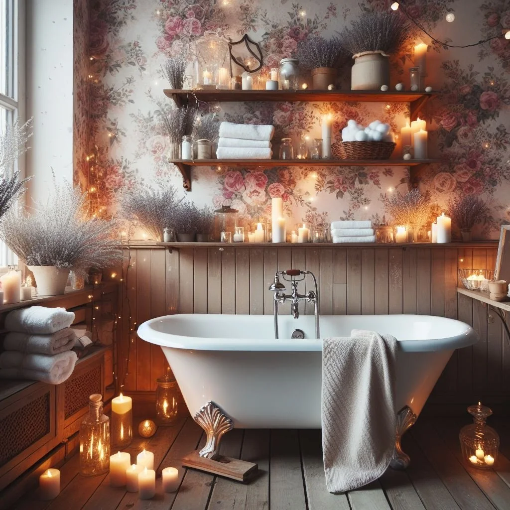 Illuminate your cottagecore bathroom with soft, inviting illumination provided by vintage-inspired light fixtures such as sconces or pendant lights. These timeless additions infuse your space with an aura of old-world charm, contributing to the cozy and welcoming ambiance characteristic of cottagecore style. Their gentle glow casts a warm and inviting light, perfect for unwinding after a long day or indulging in a luxurious bath. Whether adorned with intricate detailing or showcasing simple elegance, vintage light fixtures serve as both functional lighting elements and captivating decorative accents, further enhancing the rustic and whimsical atmosphere of your cottagecore retreat.