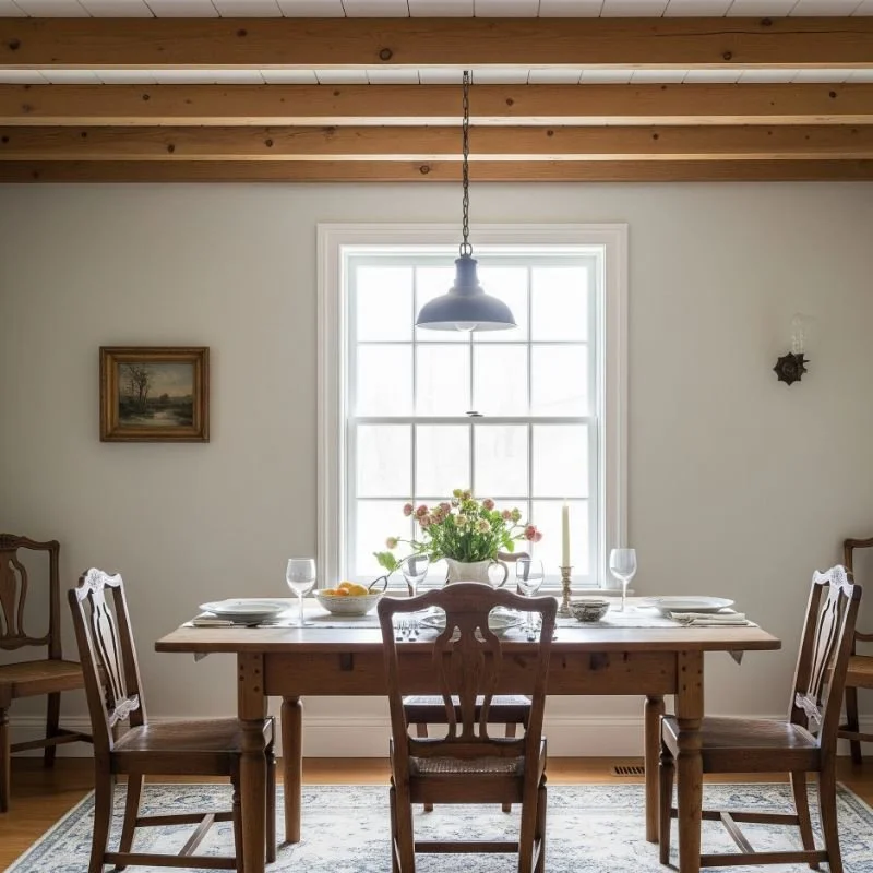 Look up and let exposed wooden beams transport you to a centuries-old cottage where time moves slowly and meals stretch leisurely. Whether you're blessed with original beams or add faux ones, this architectural element instantly adds rustic charm and visual weight to your dining room. Dark, weathered beams create dramatic contrast against white ceilings, while lighter honey tones maintain an airy feel. The natural texture and grain patterns draw the eye upward, making even modest spaces feel more substantial. Consider hanging dried herbs or vintage baskets from the beams, adding both function and charm. This single element can transform a bland box into a space that feels rooted in history and tradition.