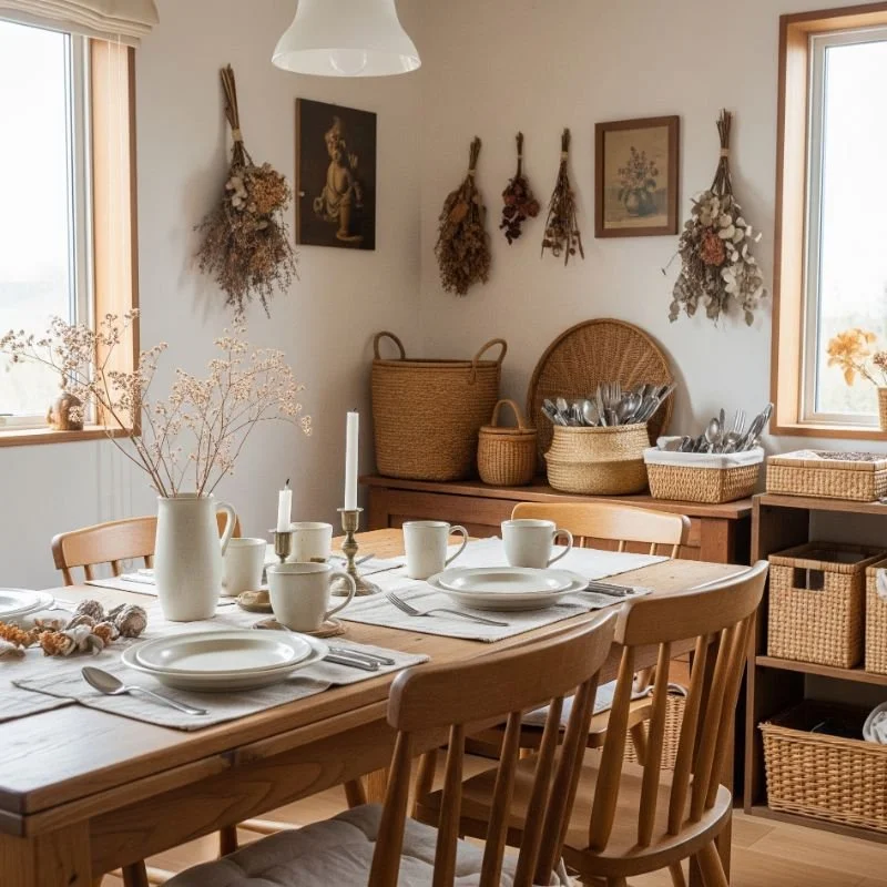 Extend the life of your garden's beauty by incorporating dried flowers that maintain their charm long after fresh blooms fade. Create arrangements using lavender, statice, baby's breath, and roses hung upside down until perfectly preserved. Display them in vintage vases or create wreaths for walls and windows that evolve with seasons. The muted colors of dried flowers complement the soft palette of cottagecore perfectly while requiring no maintenance. Hang small bundles from beams or display them in unexpected places like tucked into shelving or suspended from ribbon. These everlasting blooms ensure your dining room maintains its connection to nature year-round, regardless of what's growing outside.