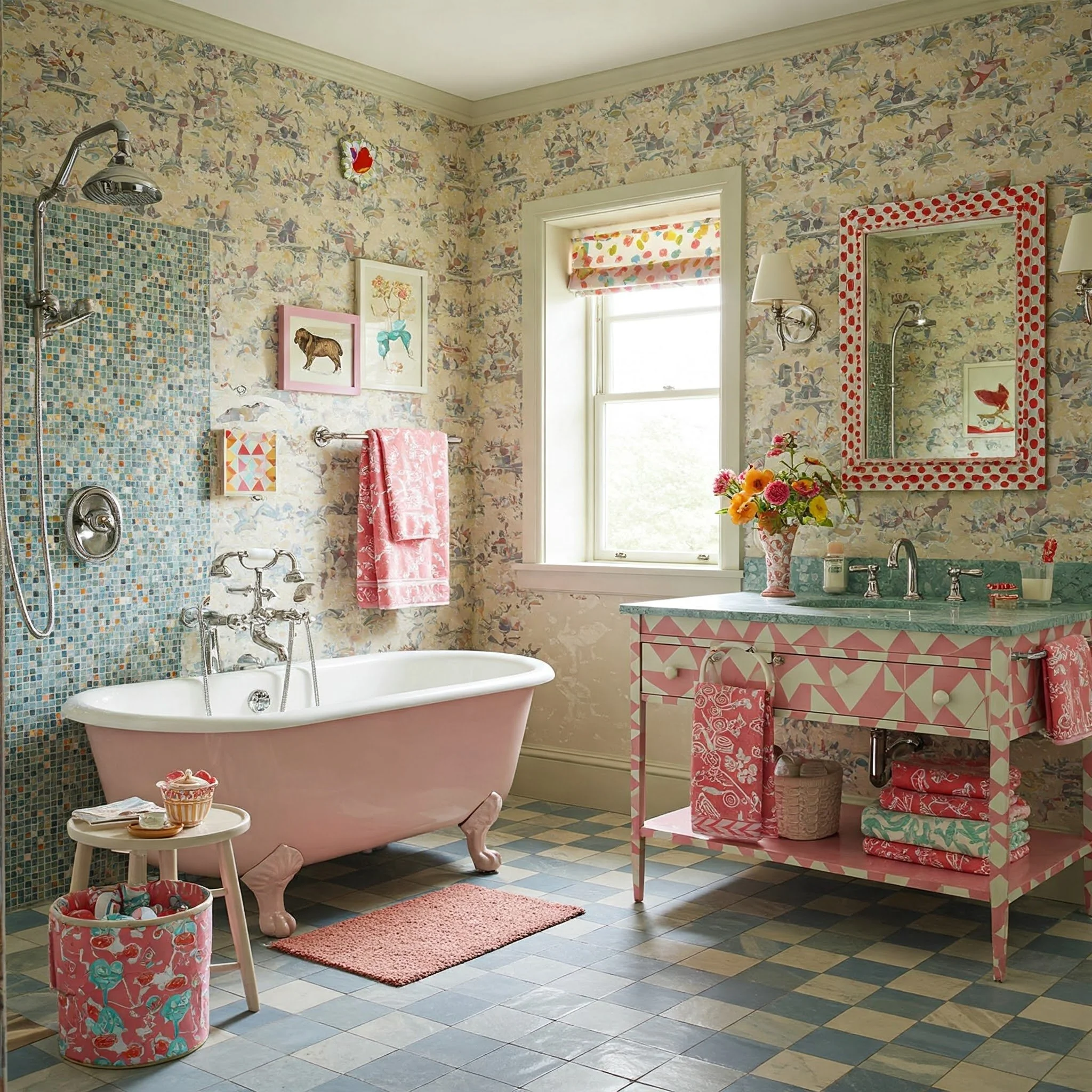 A country bathroom doesn’t have to be all wood and neutral palettes. Feel free to play around with playful patterns like gingham, plaid, or floral prints. Whether you choose curtains, wallpaper, or even stenciled designs on the walls, these cheerful motifs provide a lively contrast to the rustic elements. Picture a checkered shower curtain that makes you smile each morning, or a subtle floral wallpaper that ties the room together without overwhelming it. The trick is balance: if you opt for bold prints on the walls, keep the rest of the space fairly understated. Conversely, if your bathroom is predominantly neutral, a patterned element can be just the pop of fun it needs. Ultimately, these patterns whisper of farmhouse kitchens and fields of wildflowers, reminding you that a country lifestyle is anything but dull.