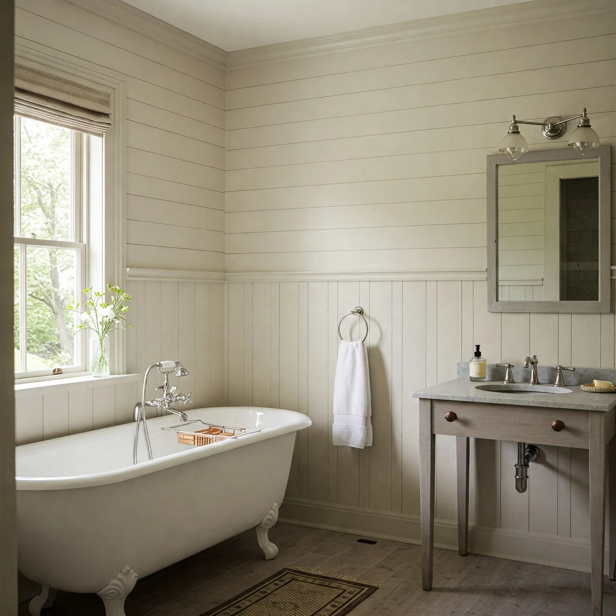 Shiplap walls or classic wainscoting are more than just a nod to farmhouse chic—they’re practically the hallmark of cozy, country-inspired interiors. The wooden planks add dimension and a subtle pattern, making even the simplest bathroom exude character. Shiplap, with its horizontal lines, can visually widen your space, while wainscoting breaks up bare walls for a more structured look. Painting the shiplap in soft neutrals—cream, light gray, or pastel blues—can create a serene backdrop for your other design elements. If you prefer a more authentic, rustic approach, leave the wood unpainted to show off its grain. Either way, this stylistic choice instantly elevates a plain bathroom from functional to farmhouse fabulous, hinting at slow mornings and leisurely baths surrounded by the comforts of country living.