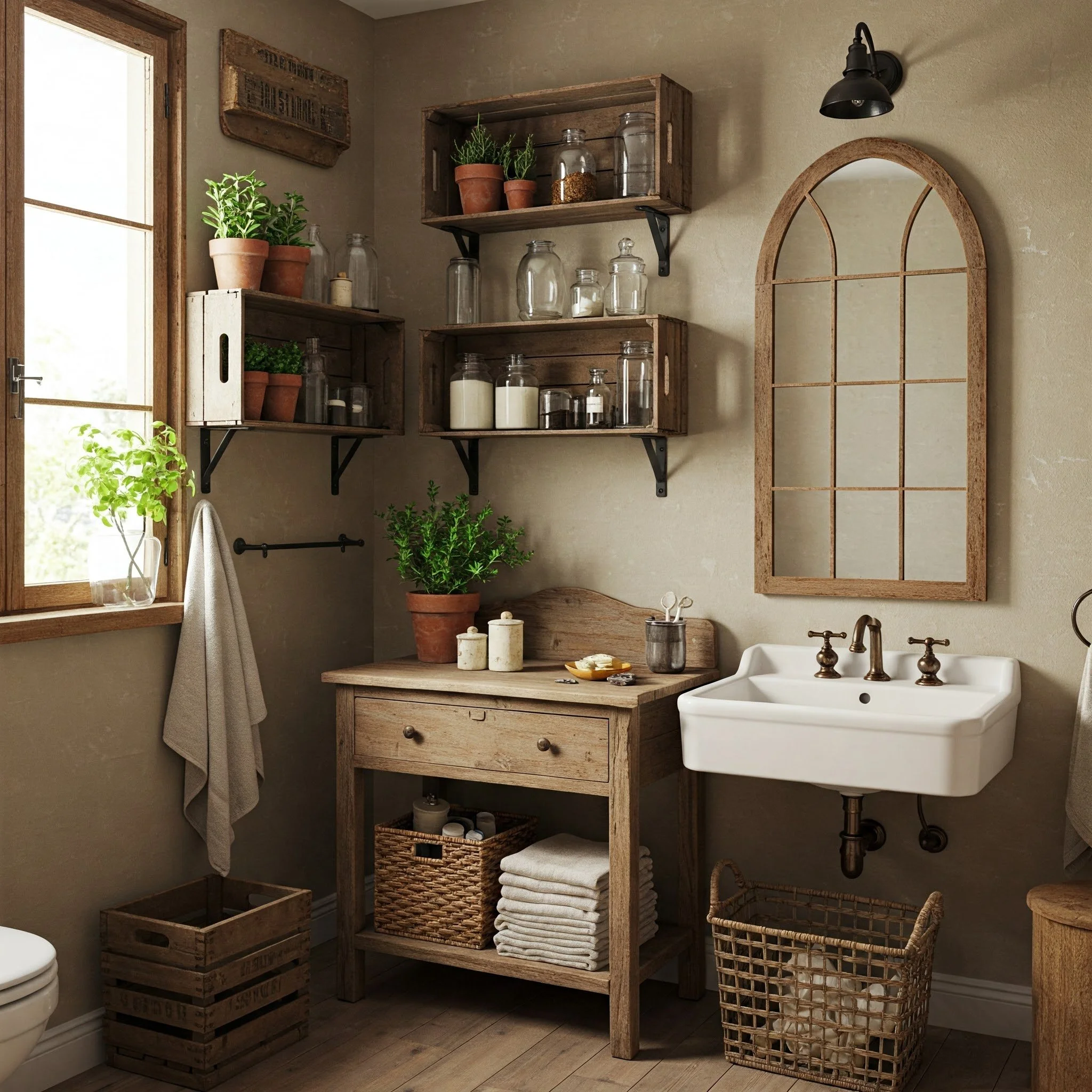 In a country bathroom, utilitarian items can become part of the decor, especially when stored in a rustic, visually appealing way. Consider open shelving fashioned from reclaimed wood, where rolled towels and mason jars of bath salts are displayed like art pieces. Or install wire baskets attached to the wall—perfect for holding magazines, toiletries, or extra toilet paper. Wooden crates stacked in a corner can function as storage cubbies, adding an effortless sense of old-fashioned charm. Even an antique ladder can become a towel rack with the simplest of modifications. The trick is to pick pieces that don’t look too polished, so they blend harmoniously with the rest of your cozy, countryside-inspired bathroom. After all, a messy shelf might be an eyesore, but a rustic one is practically decor.