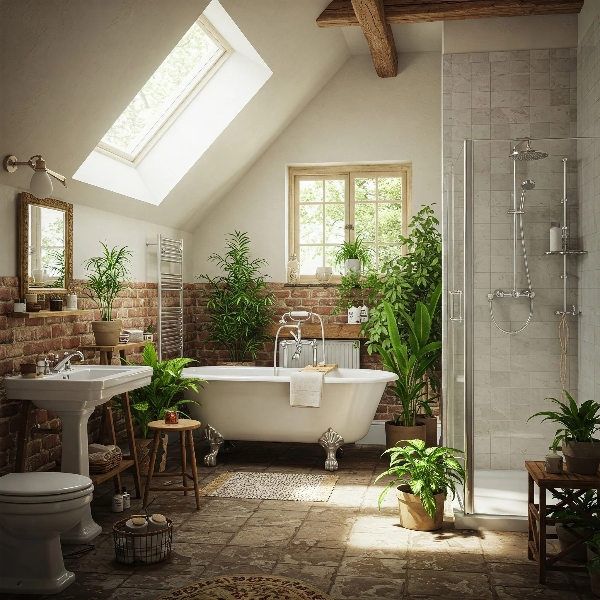Nothing says “countryside retreat” like the presence of nature. Adding a touch of greenery—be it potted plants, a small fern, or even a bouquet of fresh wildflowers—keeps the space feeling lively and organic. Imagine taking a relaxing soak while the gentle scent of eucalyptus wafts around you, or glimpsing a blooming orchid perched on the windowsill. These natural elements serve as a visual reminder of life beyond the bathroom walls, like a secret garden waiting to be explored. If you don’t have a green thumb, opt for low-maintenance plants like succulents or faux arrangements that still offer a pop of color without the upkeep. The result? Your country bathroom transforms into a mini spa oasis, where rustic wood meets the serenity of the natural world.
